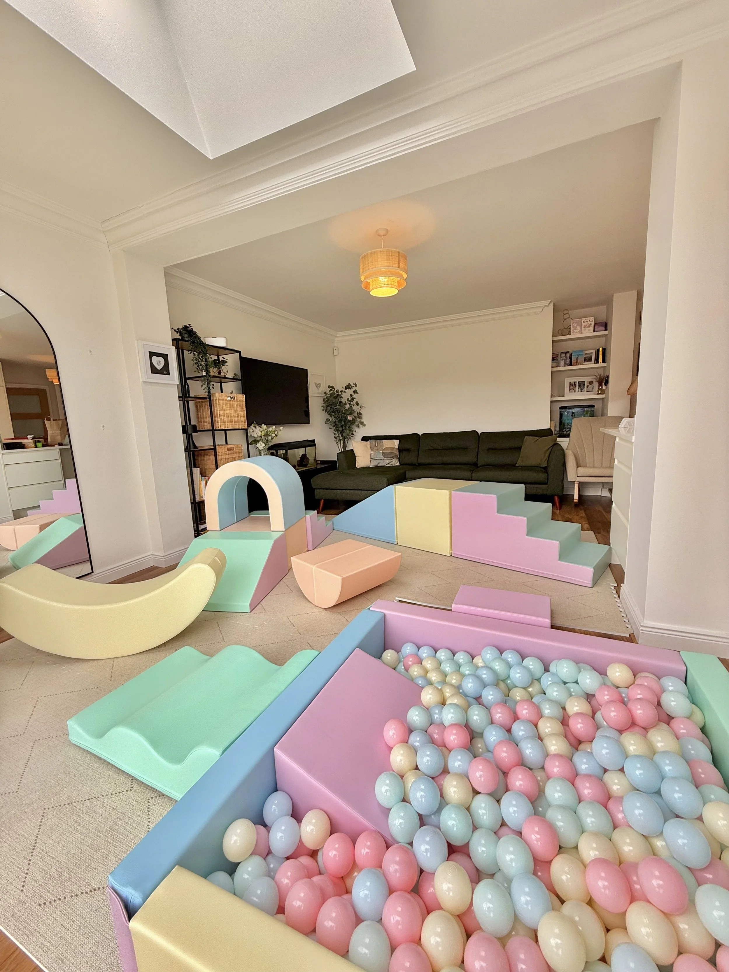 Perfect for birthdays, christenings, or family events. Neutral pastel colours keep it stylish and photo-ready, and the large foam mat ensures a soft, safe play space.